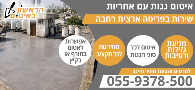 מחפשים שירותי איטום גגות מקצועיים? אנחנו בחברת הראשון באיטום מספקים שירותי איטום לכל סוגי הגגות, כולל אחריות על העבודה, עם התחייבות לעמידות ולמחיר הוגן. נגיע אליכם במהירות, נבחן את הגג ונתאים את הפתרון המדויק ביותר לצורך שלכם. אל תחכו שהגשם הראשון יפתיע אתכם – פנו אלינו כבר עכשיו וקבלו הצעת מחיר משתלמת – החל מ-25 ₪ למ"ר!